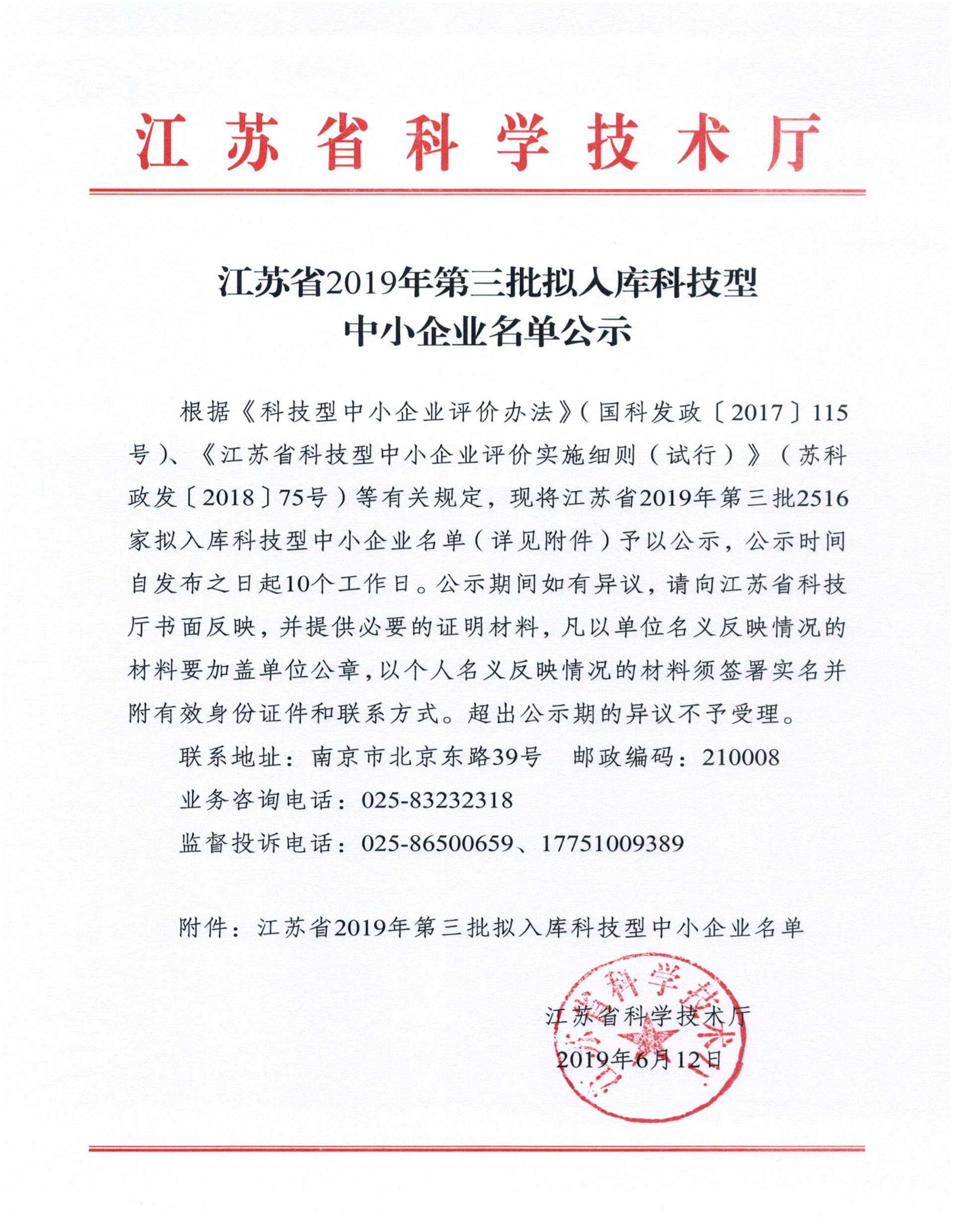 江蘇省2019年第三批擬入庫科技型中小企業(yè)名單公示